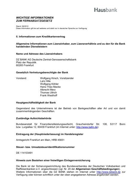 Fernabsatz Informationen Zum Kreditkartenvertrag Hausbank